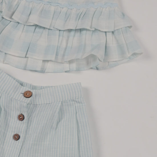Dress your little one in this charming Light Blue Checks Top and Striped Pants Set, perfect for both kids and infants. The top features an adorable Light Blue checks pattern with adjustable shoulder straps and tiered gaidered design, while the matching striped pants add a playful touch. The infant size comes with a matching bloomer for a complete look.