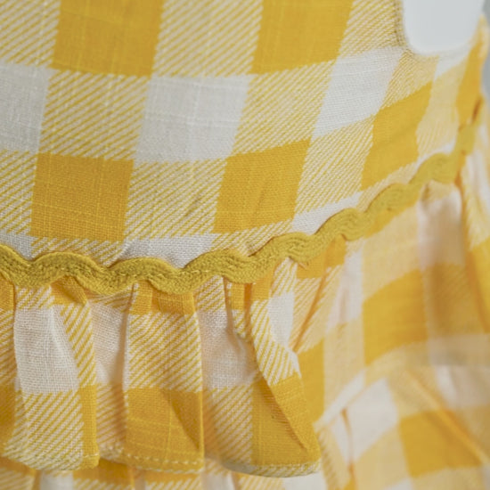 Dress your little one in this charming Yellow Checks Top and Striped Pants Set, perfect for both kids and infants. The top features an adorable yellow checks pattern with adjustable shoulder straps and tiered gaidered design, while the matching striped pants add a playful touch. The infant size comes with a matching bloomer for a complete look.