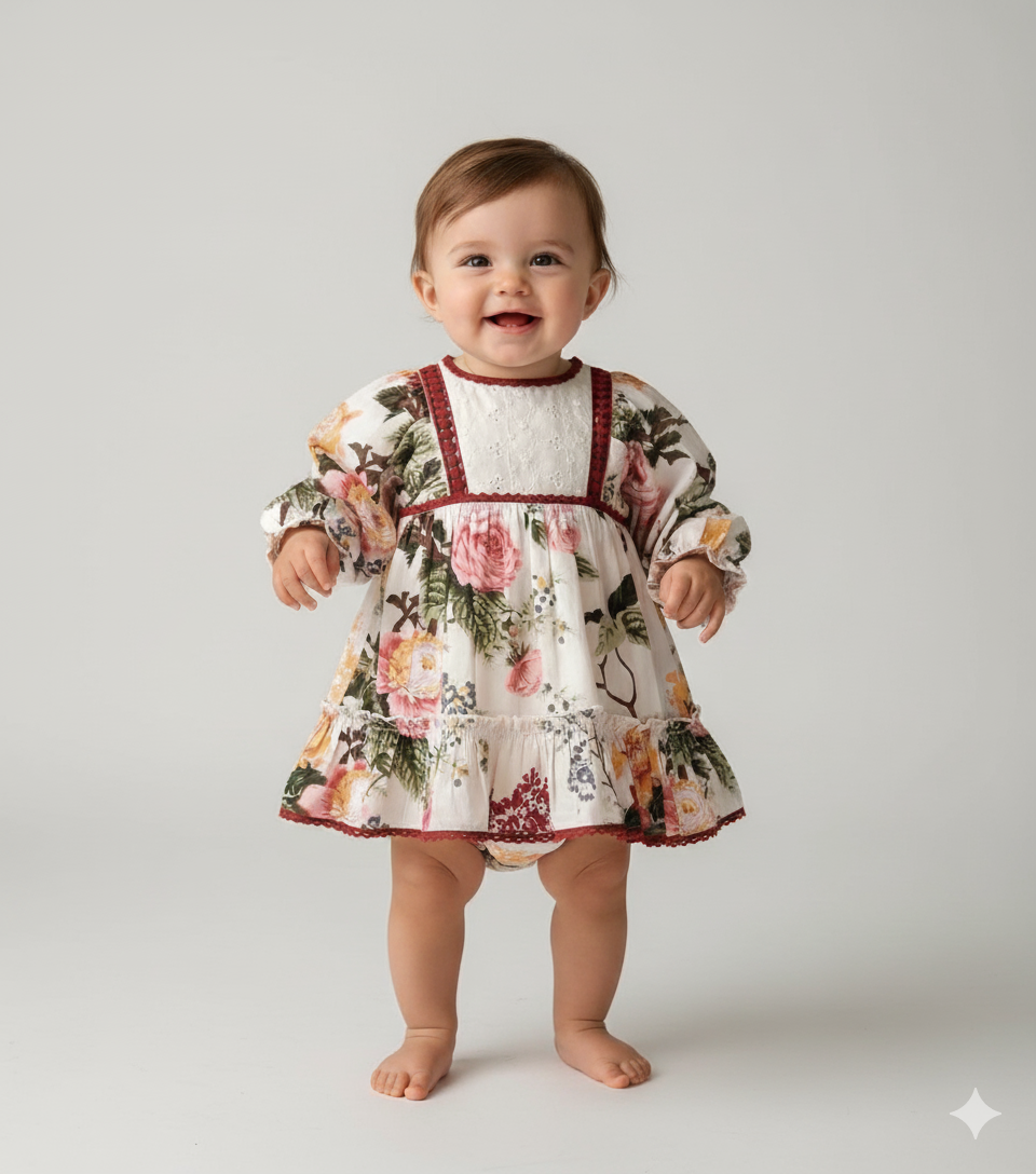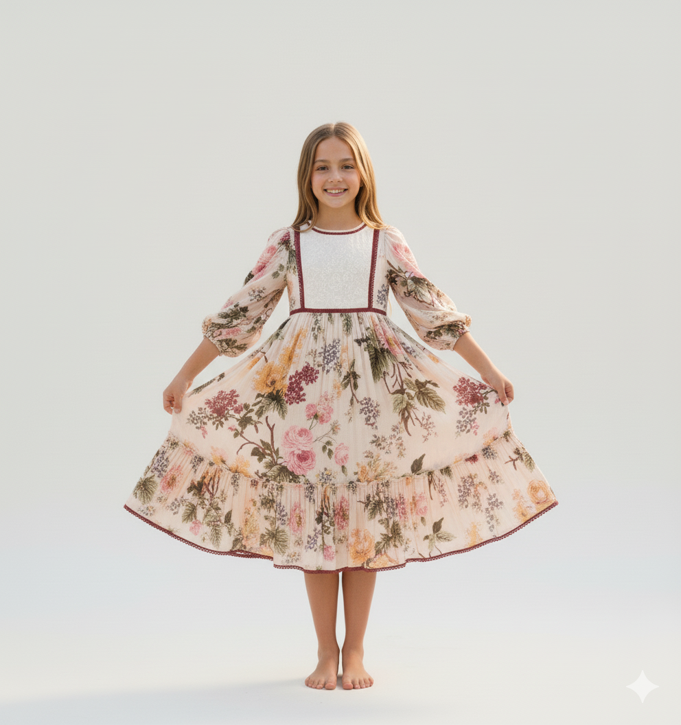 This dress is perfect for mother-daughter matching outfits, Dress, available for infants, kids, and women. creating a timeless and elegant look. Embrace the beauty of intricate detailing and sophisticated design with this charming beige floral dress.