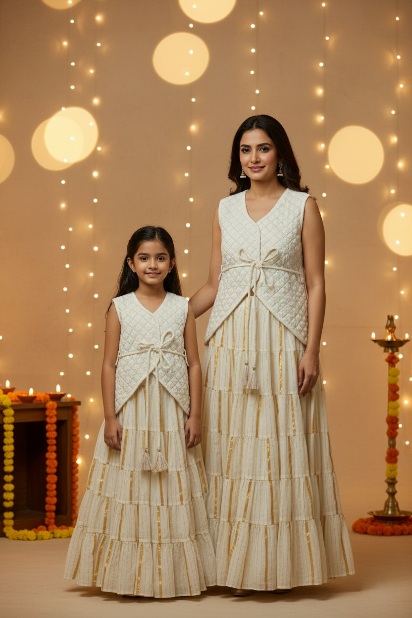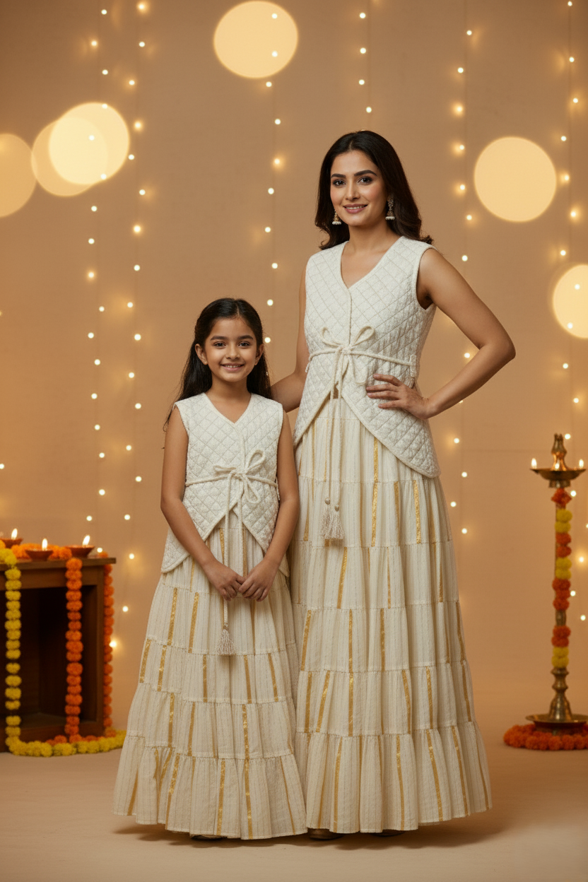 Celebrate the most wonderful time of the year with our Velvet Waistcoat & Gathered Skirt Set, a perfect ode to the vibrant festivities of Diwali and Navratri.