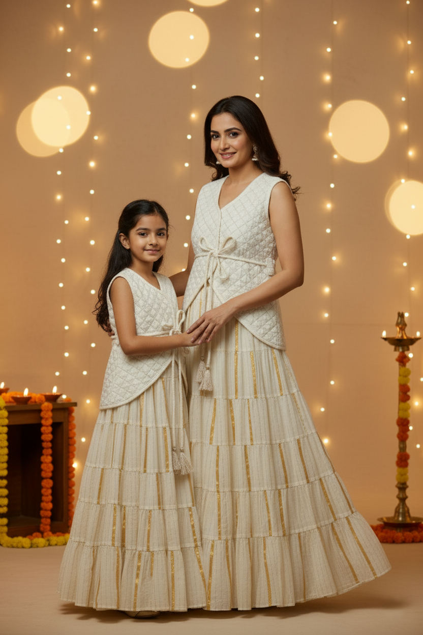 Embody the grace of the season with this enchanting ensemble. The luxurious velvet waistcoat, with its rich texture, feels as opulent as the lamps lit for Diwali, while the beautifully gathered skirt flows with the spirit of Garba and Dandiya. This set is crafted for joyous occasions, whether you're performing aarti, exchanging sweets, or dancing the night away. It's more than an outfit; it's a celebration of tradition and modern elegance, designed to make you shine as brightly as the festival lights.