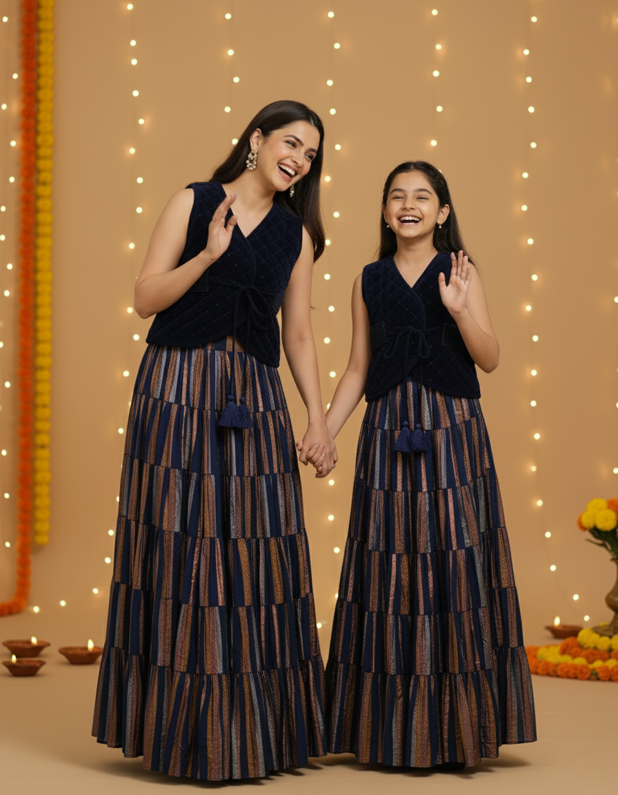 Embody the grace of the season with this enchanting ensemble. The luxurious velvet waistcoat, with its rich texture, feels as opulent as the lamps lit for Diwali, while the beautifully gathered skirt flows with the spirit of Garba and Dandiya. This set is crafted for joyous occasions, whether you're performing aarti, exchanging sweets, or dancing the night away. It's more than an outfit; it's a celebration of tradition and modern elegance, designed to make you shine as brightly as the festival lights.