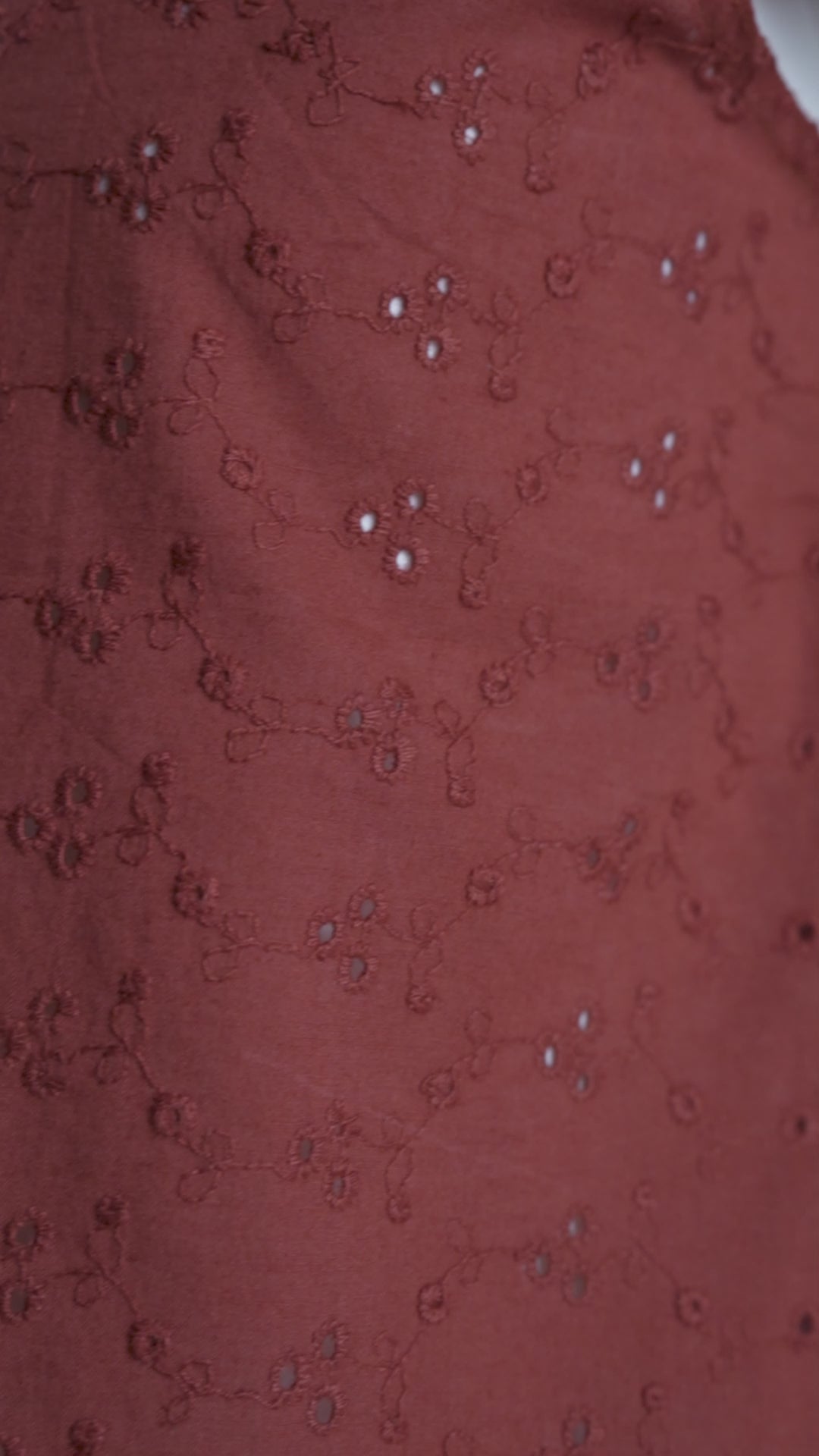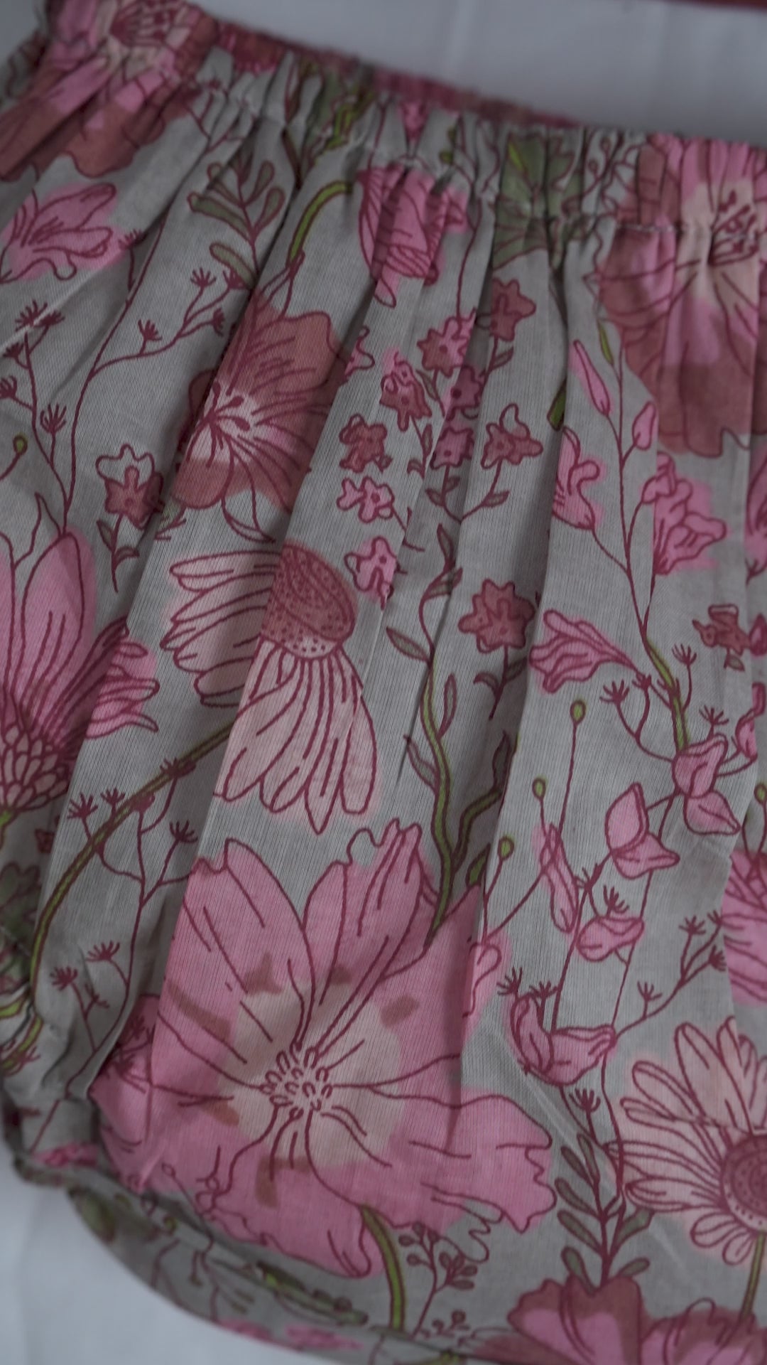 - Details: Contrast Emroidered eyelet solid fabric. Frill Sleeves. Frill on the printed bloomers. Scalloped shorts.