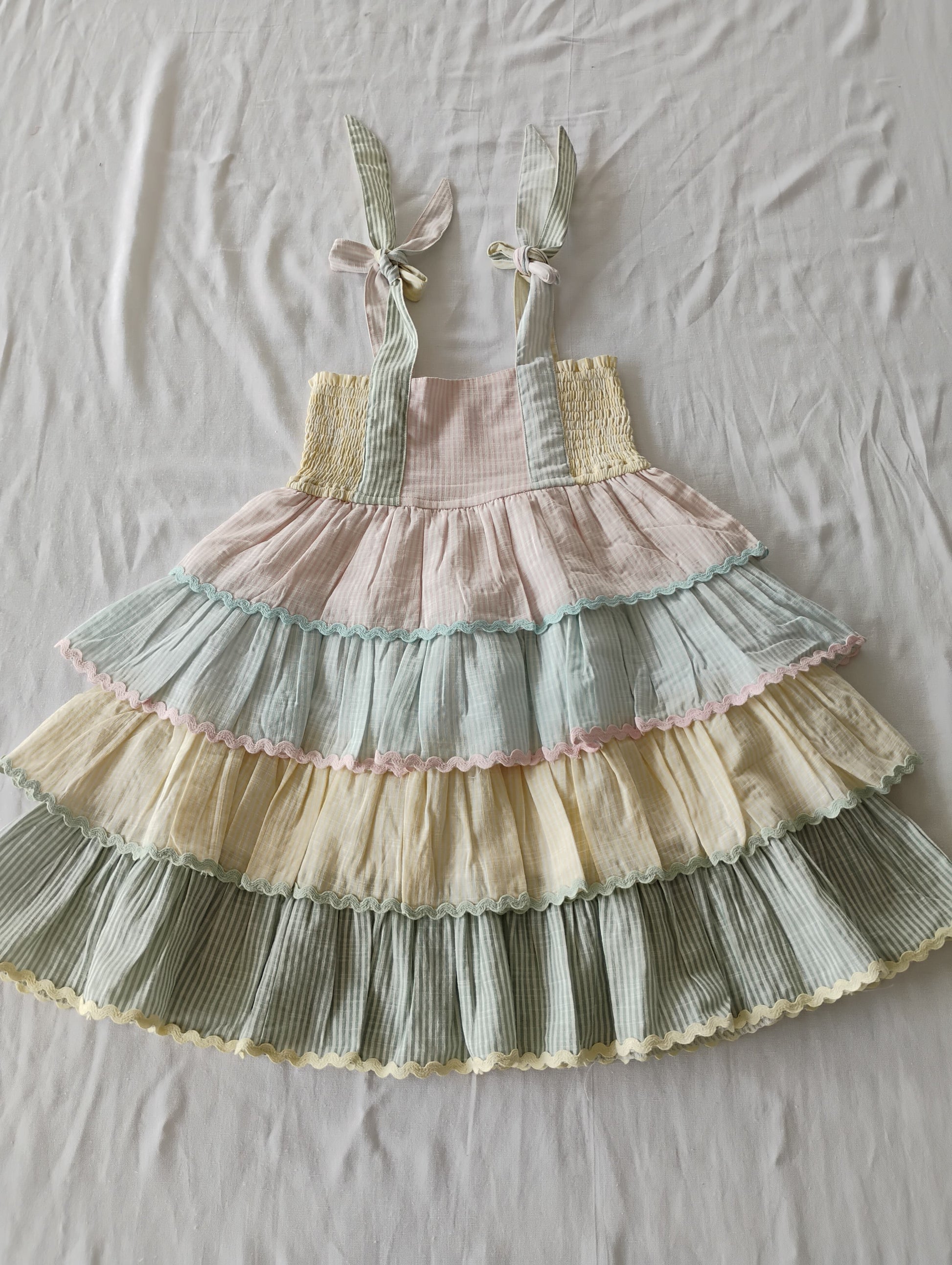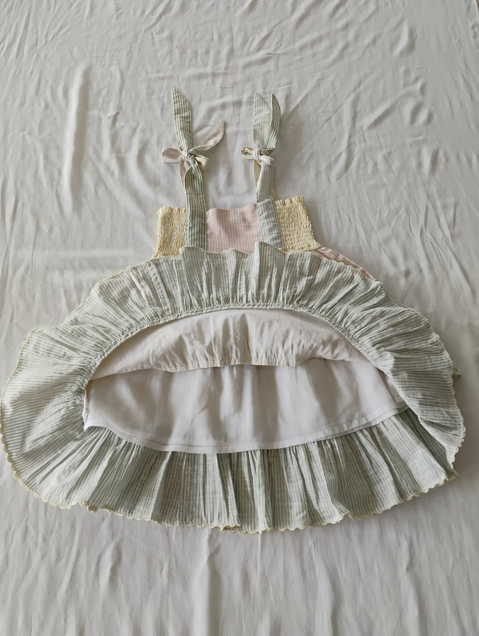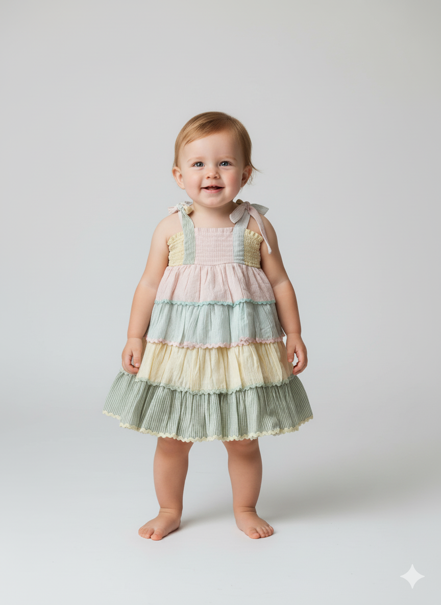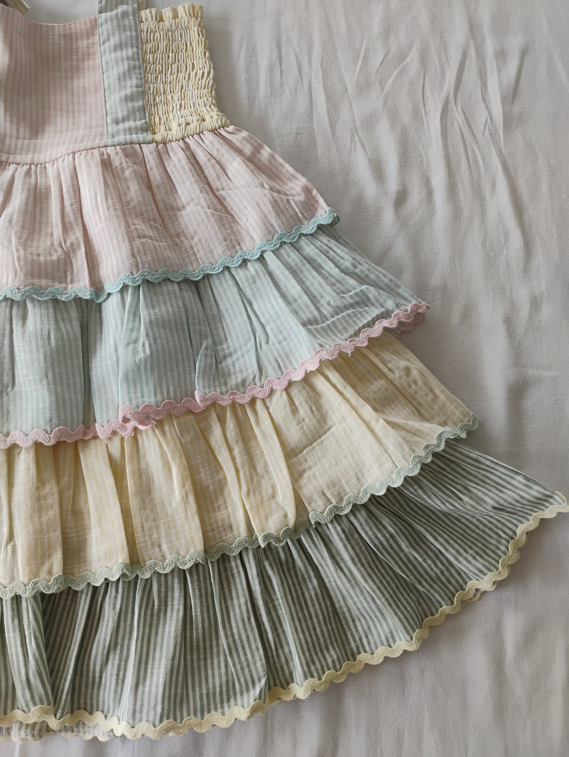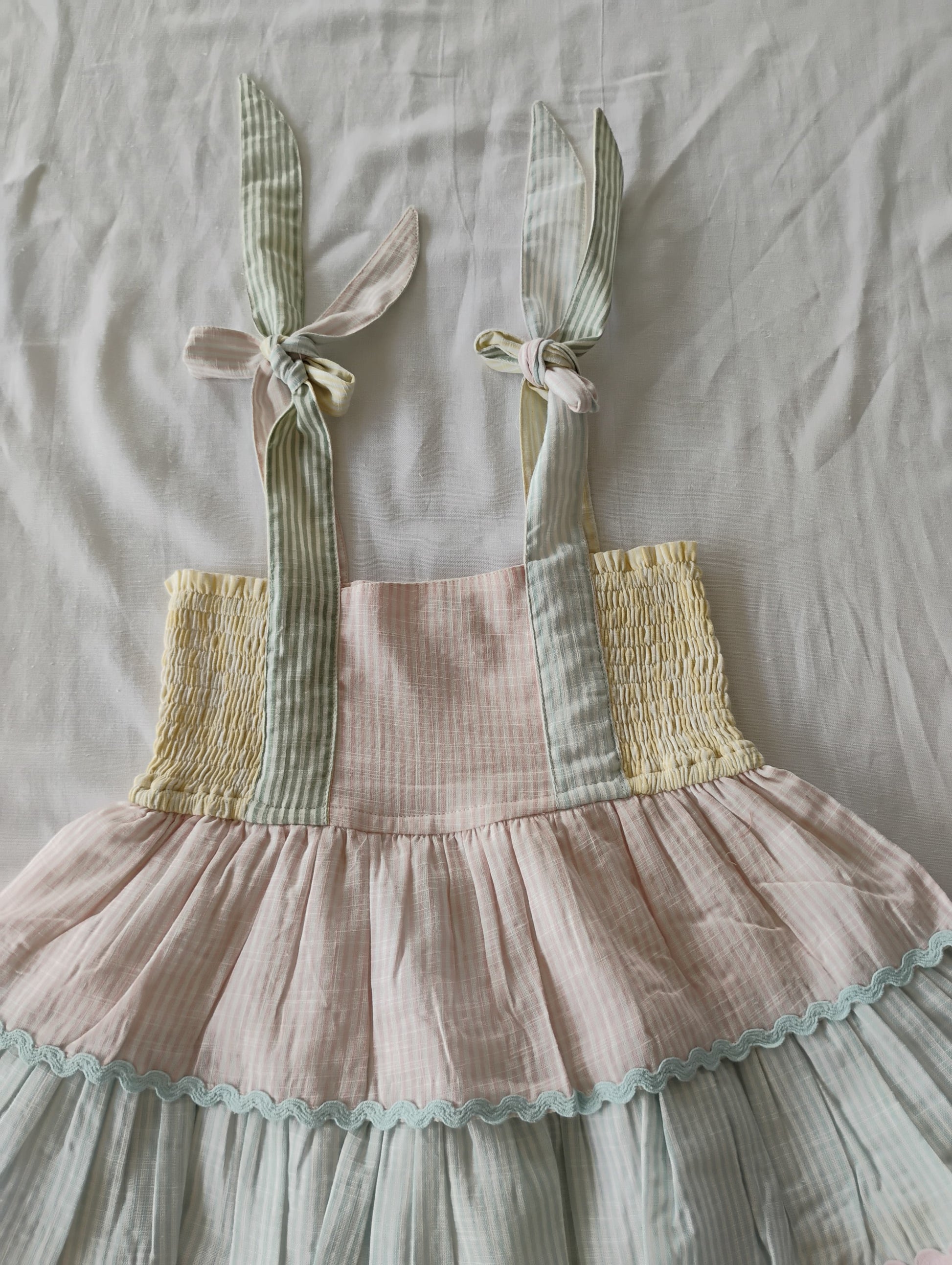 Details: Multi-color pastel dress featuring a smocked bodice and tie-up shoulders. Designed in soft shades of pink, blue, and yellow with contrast decorative edge stitch on each layer for a playful finish. Available in infant sizes with a matching diaper cover.