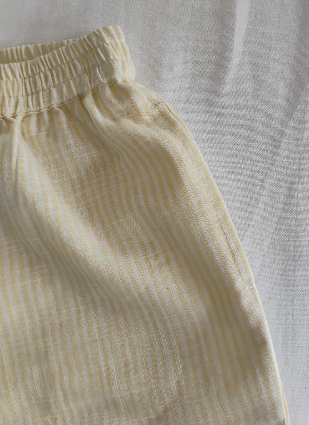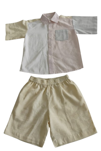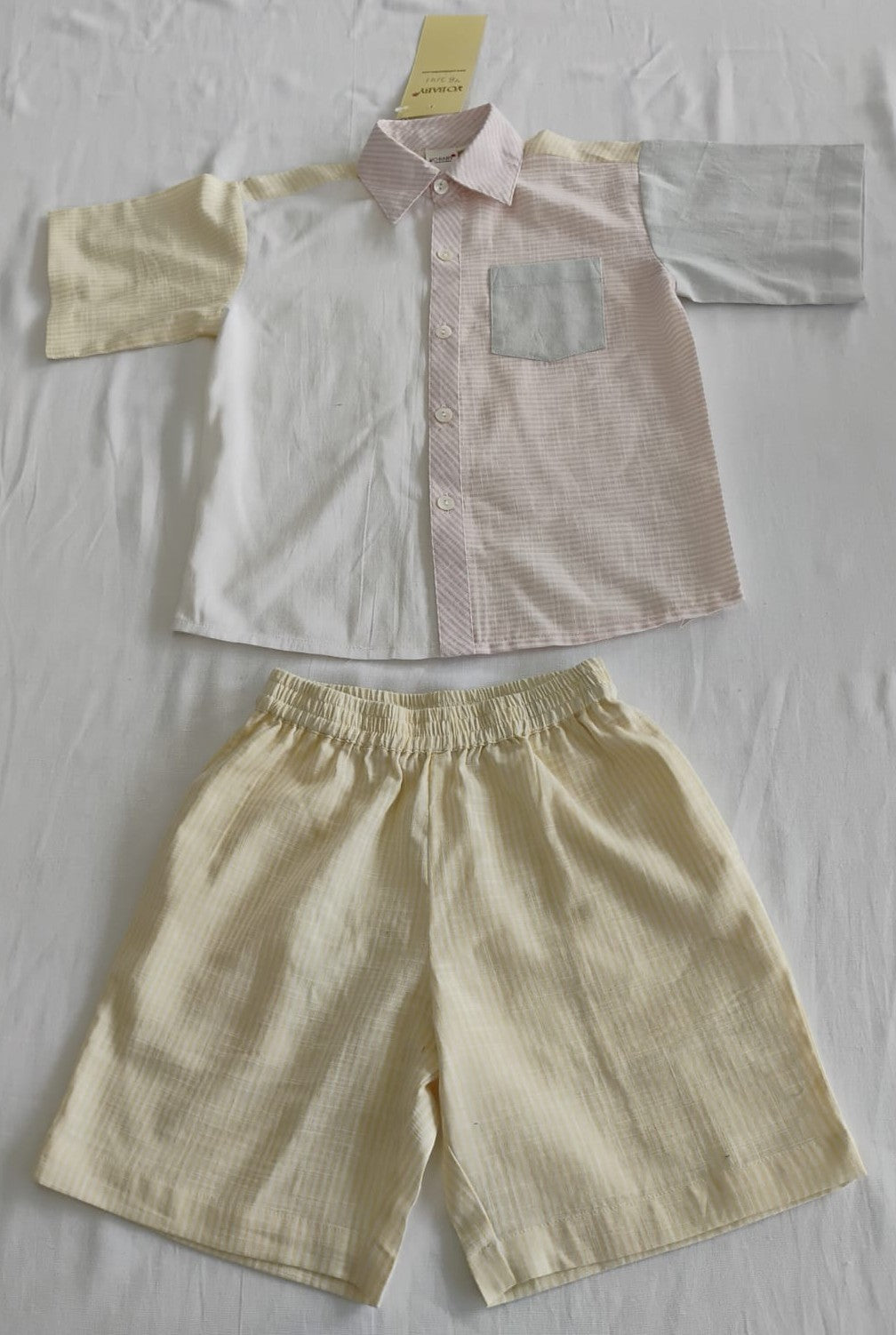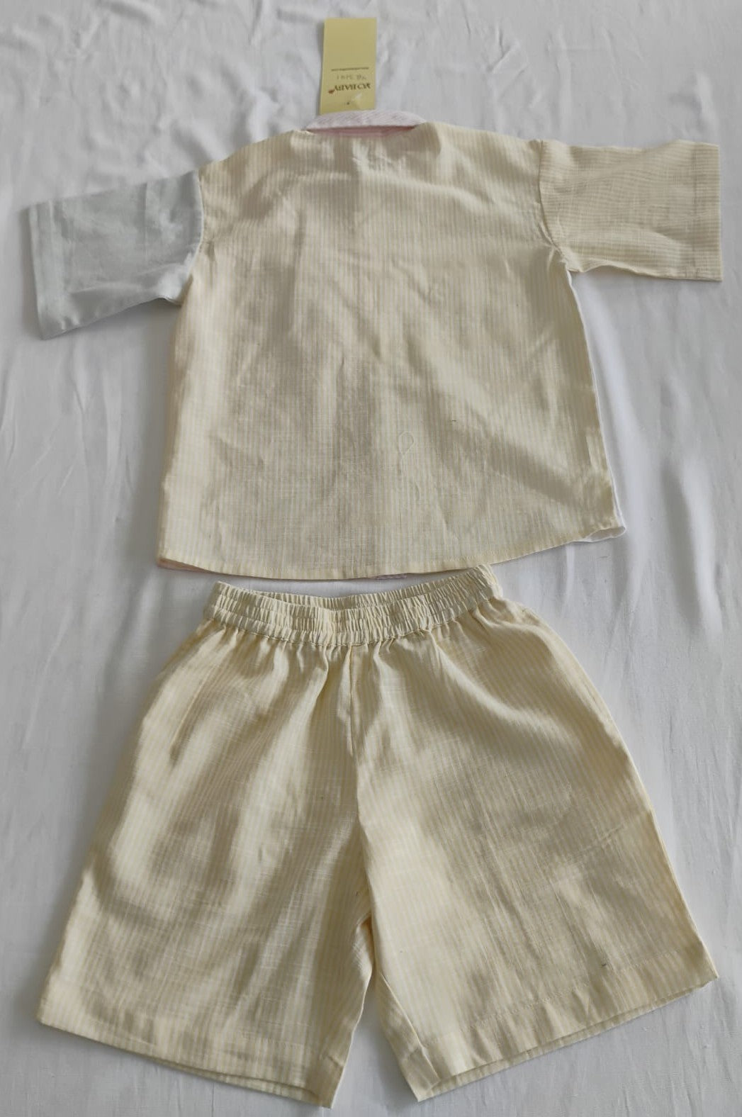 Details: Boxy fit gender neutral two-piece set features shirt mix of stripes and solid colors like white, pink, yellow and blue. Comes with matching shorts in yellow stripes with inseam pockets. Available in infant sizes.