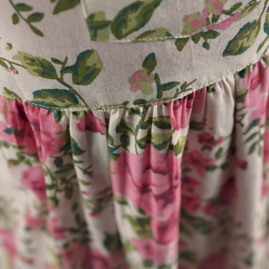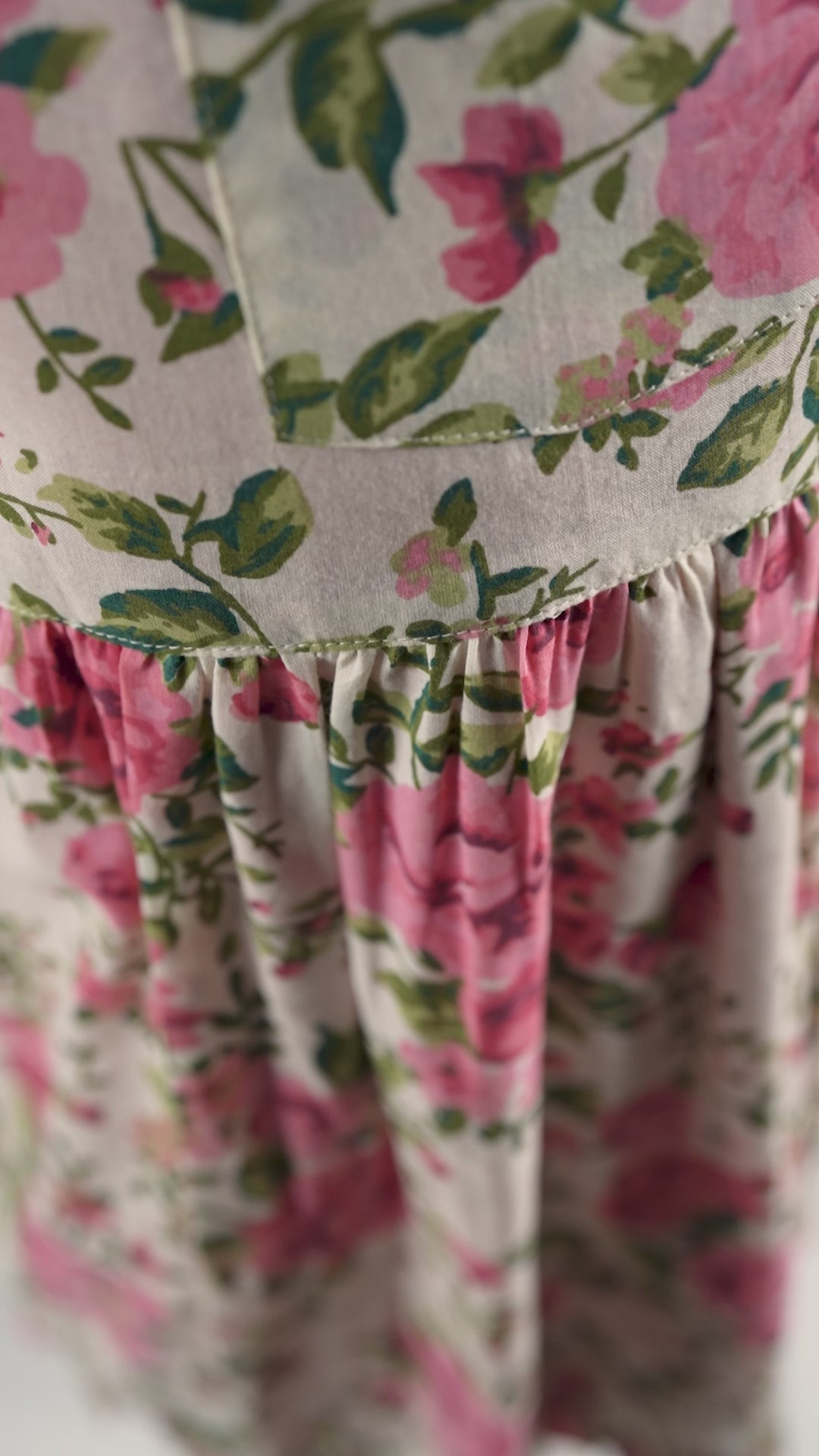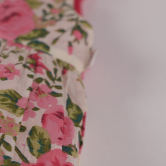 - Details: Adjustable shoulder tie-strap. Contrast pockets on both sides. Printed bottom frill visible on both sides.
