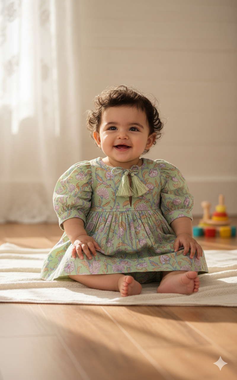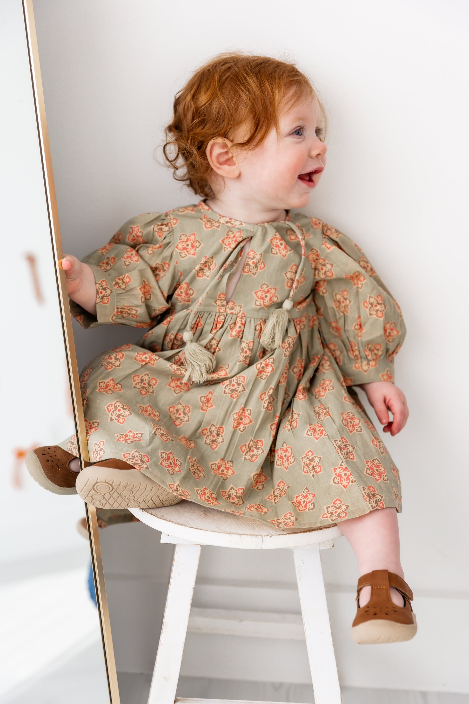 Sage-Green Floral Printed Sleeve Gathered Dress