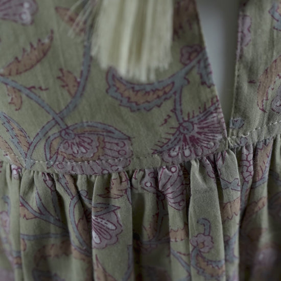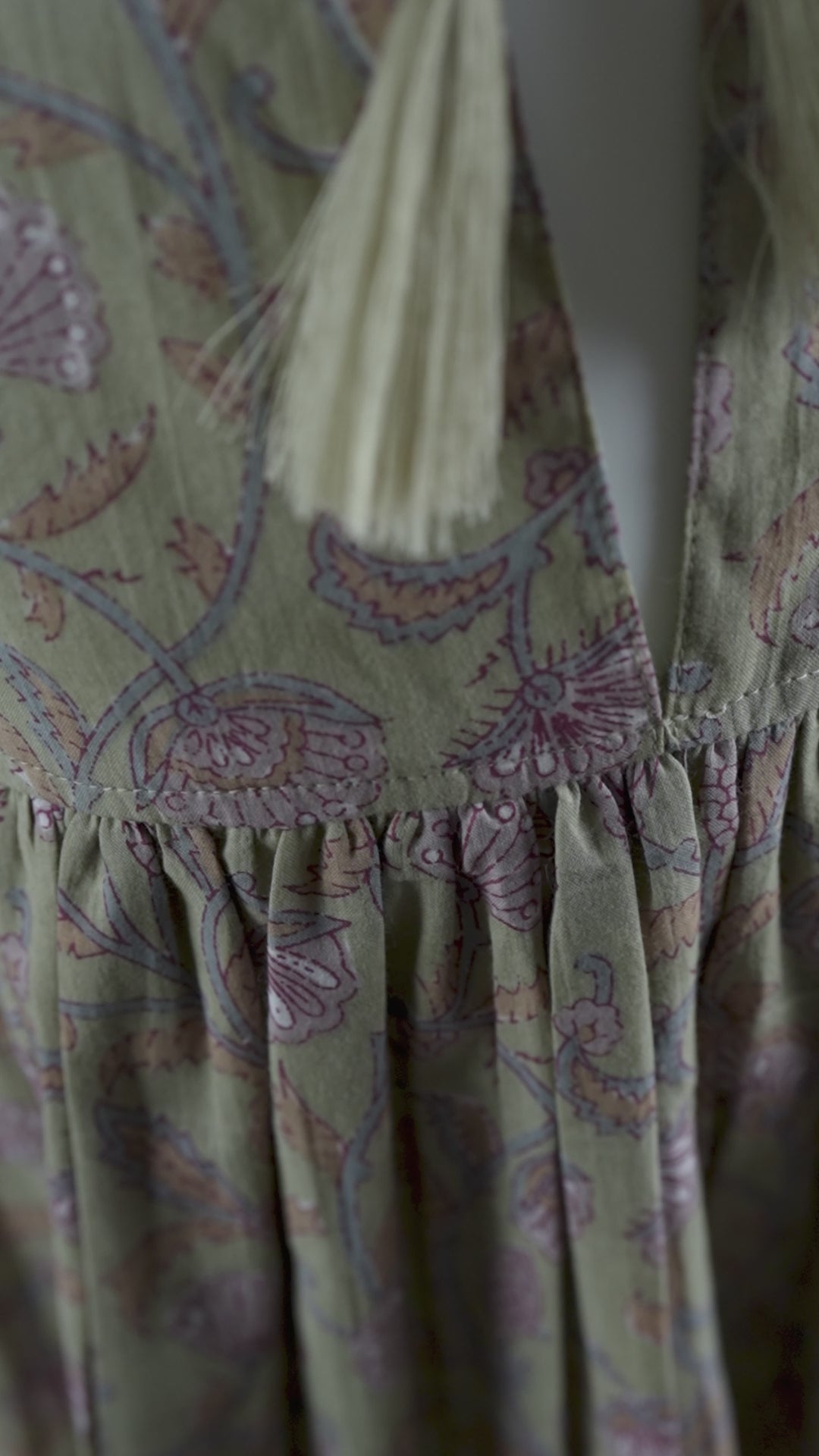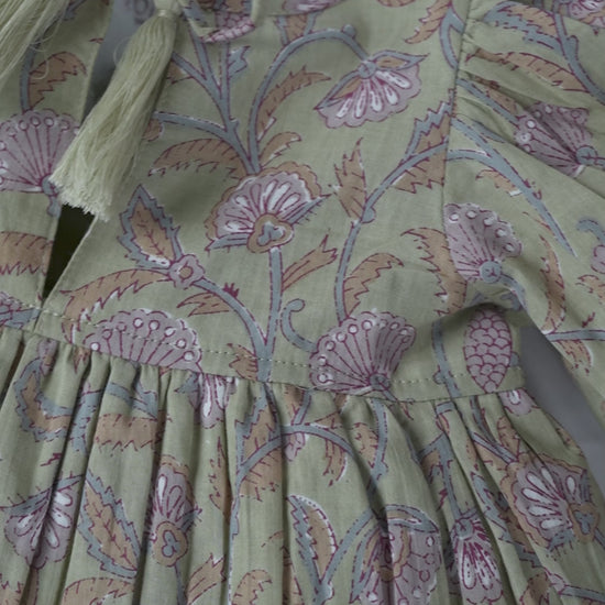 Sage-Green Floral Printed Sleeve Gathered Dress