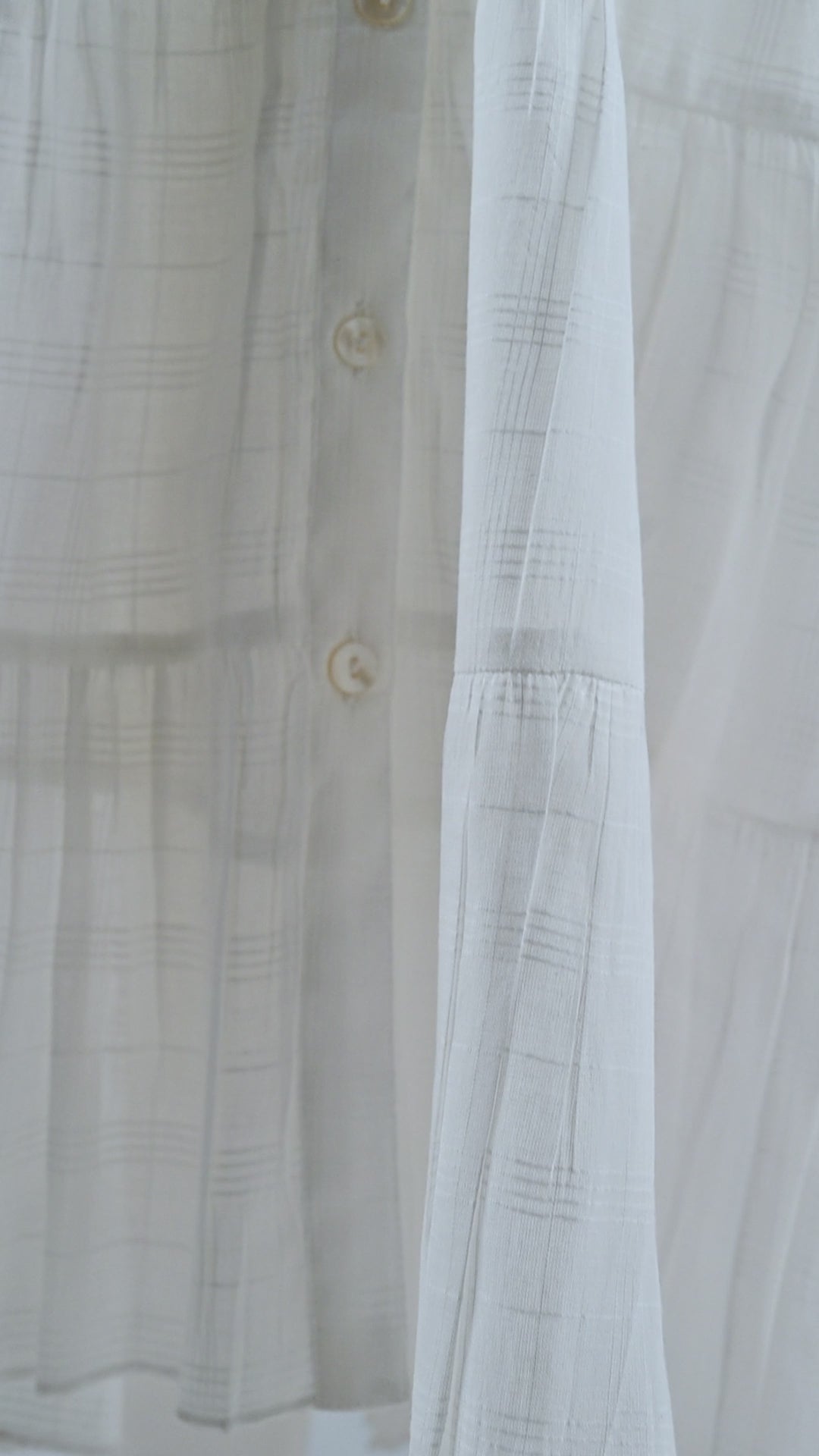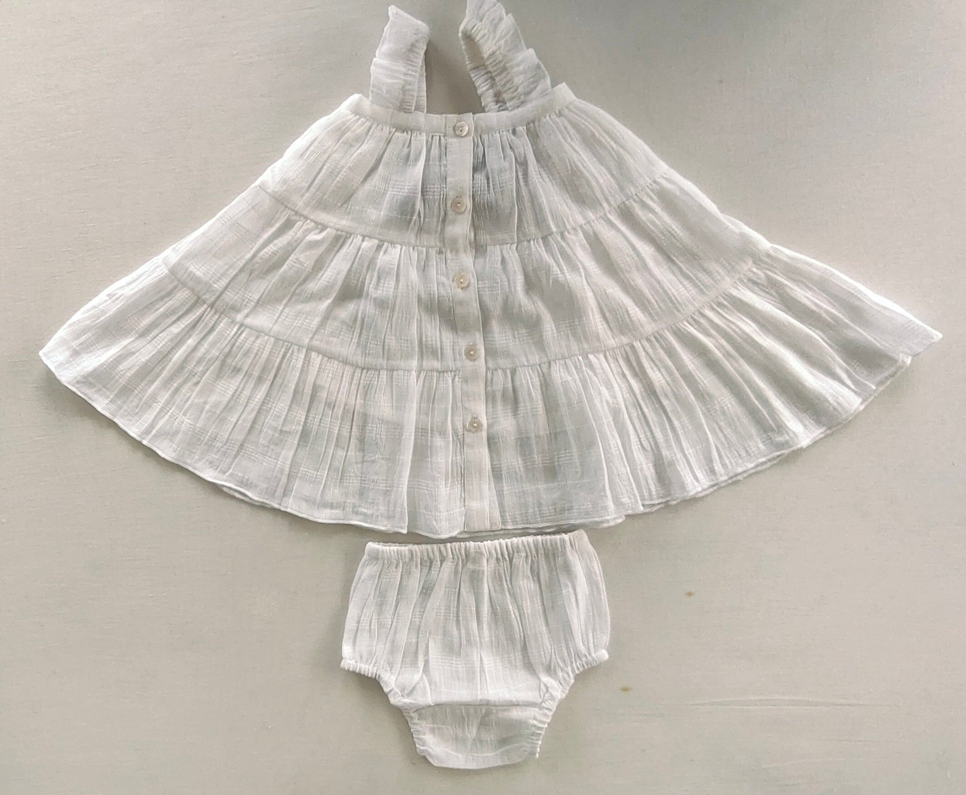 Dress your little one in our adorable White Textured Checks Multi-Tiered Ruffle Dress, crafted from soft cotton for comfort and style. This charming dress features multiple tiers of ruffles for a whimsical look, complemented by wooden buttons on the front.